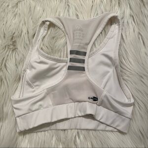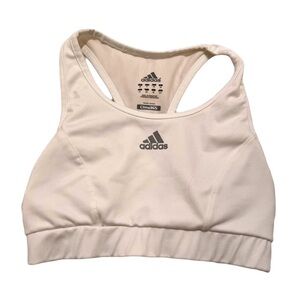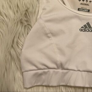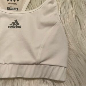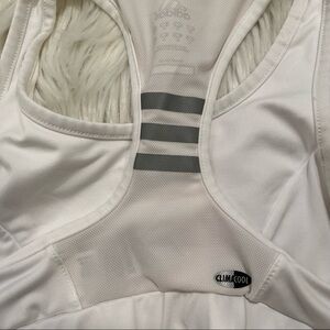 Great condition, minor wear. Adidas. Racerback sports bra. White. Mesh back. Climalite. Size small. Stretch 90% polyester, 10% spandex. Pit to pit laying flat 12” Shoulder to hem 11”. All measurements are approximate and taken lying flat. Smoke free home. No trades, offers welcome.