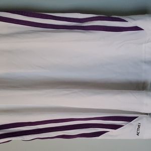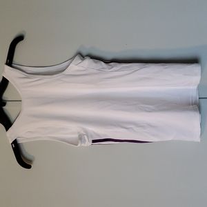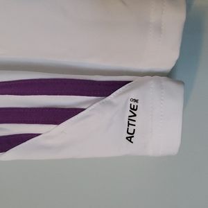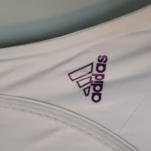- Adidas racerback tank - Women's small - Features iconic Adidas 3 stripe - Very gently used - White with purple stripes and logo
