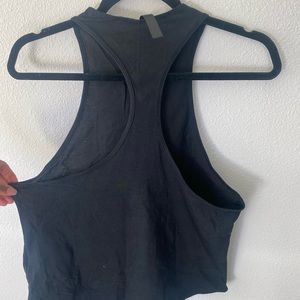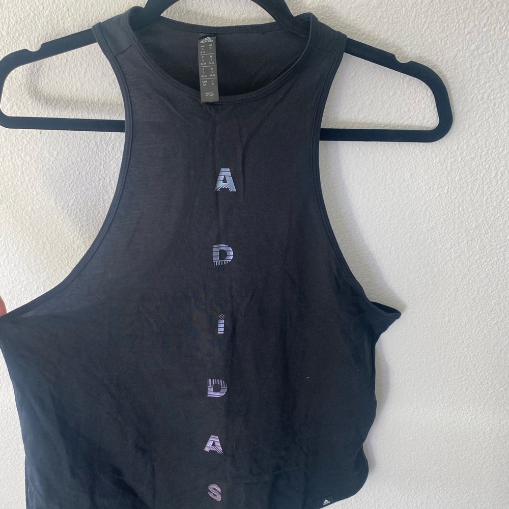 Adidas black racer back tank. Metallic letters going down the front of shirt. High neck. Never worn, only tried on but no tags.