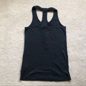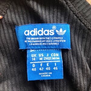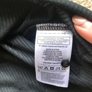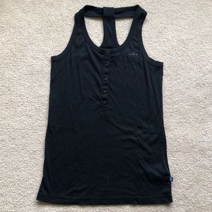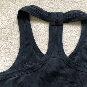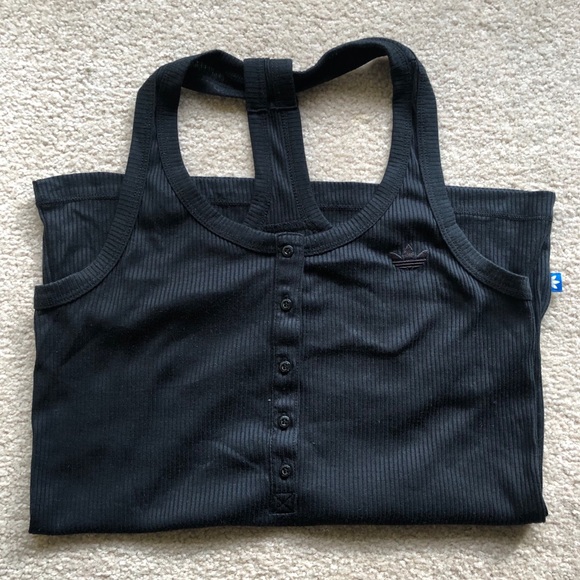 Adidas black, racerback tank top. Ribbed with five (5) functional buttons. Embroidered Adidas logo on left chest. 70% polyester, 30% cotton. Made in China.