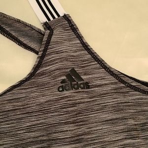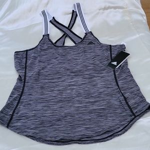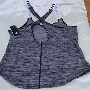 New. 3 stripes white elastic band criss-cross open back. Climalite technology. Logo on left chest. Pit to pit stretches up 22"-22". Length up to 28"