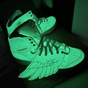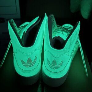 This Collectors Item Adidas Rare JS Wings GID Jeremy Scott Glow In The Dark Sneakers in US Men's size 8.5 are a unique and stylish shoe that combines fashion and functionality. Made with white leather and featuring a high-top lace-up closure, these sneakers are perfect for casual or activewear occasions. The standout feature of these shoes is the glow-in-the-dark design, adding a fun and distinctive touch to any outfit. Released in 2011 as part of the adidas Jeremy Scott products as a collectors specialty item, these sneakers are a must-have for collectors and fashion enthusiasts alike. After charging in the sun, these shoes glow bright green in dimly lit areas. A wow factor pair of sneakers!!