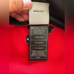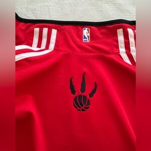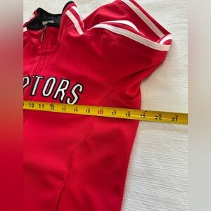 Vibrant red jacket with Raptors emblem. Features Adidas and NBA logos. Perfect for fans.