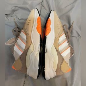 Stylish adidas athletic shoes. Features tan and orange accents. Comfortable and durable design.