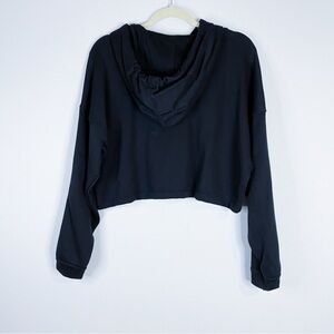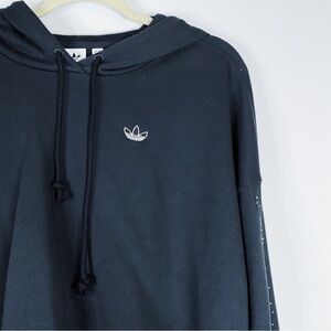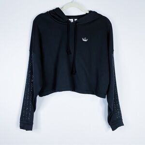 Adidas black crop jacket with three stripe detail at sleeves with rhinestone embellishments. Embroidered logo at chest.