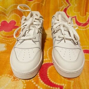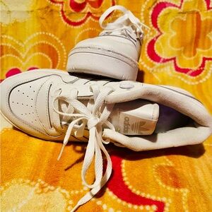 The shoes are white Adidas Rivalry Low sneakers, a classic low-top style with a retro basketball design. They feature a leather upper, a durable rubber sole, and the brand's signature three stripes on the side.