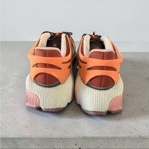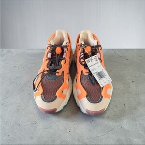 Bold pair of Adidas Originals sneakers featuring a unique layered design with vibrant orange accents, tan panels, and classic 3-stripes branding. A standout style perfect for making a statement.