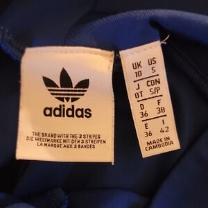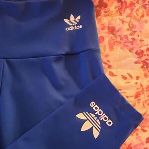 Vibrant royal blue leggings with iconic Adidas logo. Ideal for fitness and everyday style.