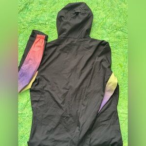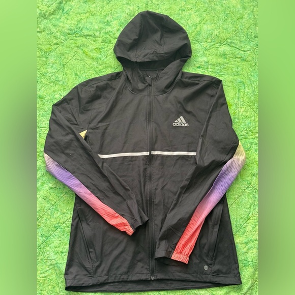 Unisex medium. Lightweight running jacket.Adidas black jacket with eye-catching sleeves in red, purple, and yellow.