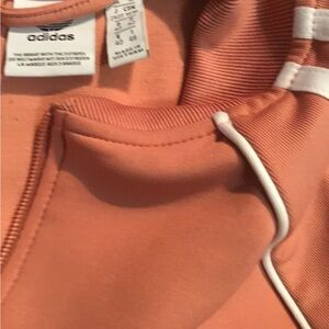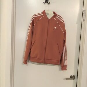 Adidas track jacket in a rust color with white stripes. Features a zip-up front and classic Adidas logo.