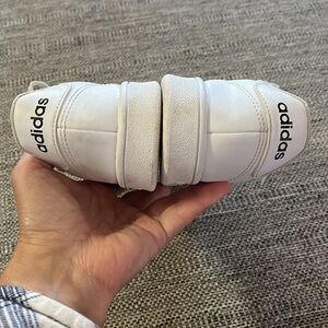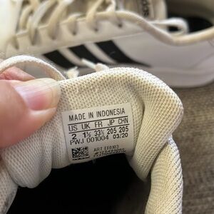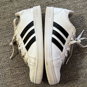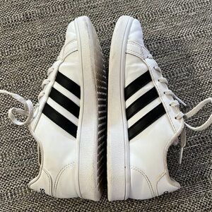 Youth size 2 Adidas tennis shoes in great used condition. My son didn’t really wear these that much. They look really good but the bottoms are just a little bit worn, doesn’t affect the shoes. See pictures for exact condition. Could use cleaning up a bit.