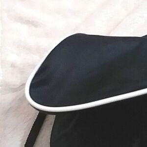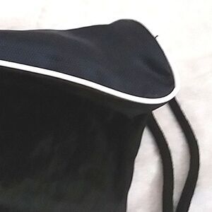 Adidas Sackpack style fold away backpack. Great looking black nylon look and feel ( like a wind breaker jacket ) cinch to close back pack. It has a wire-like white piping / edging that gives it structure and shape while still being compact and easy to pack away. Great for travel or for people with limited space. It is quite roomy.