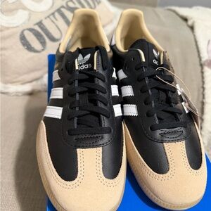 Classic Adidas Samba sneakers in black and beige with iconic white stripes. Ideal for everyday style.
