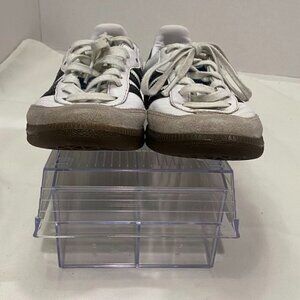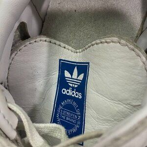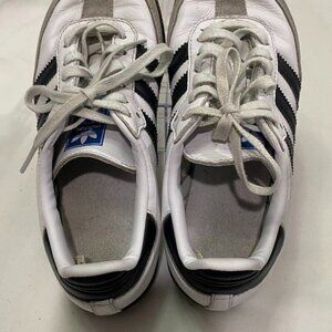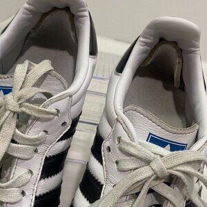 Classic Adidas Samba sneakers featuring the iconic three-stripe design in black on crisp white leather with a gum rubber sole. A heritage style beloved for its versatility and comfort. This pair has replacement insoles that are slightly miscut and will need to be replaced by the buyer.