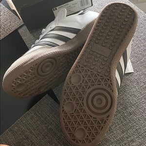 White Adidas Samba with black stripes. Features gum sole and lace-up style.