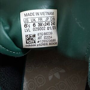 Stylish Adidas Samba shoes in forest green and light gray. Features iconic white stripes and a classic gum sole. Men’s Size 6.5. They would fit a womens size 7.5. In excellent condition with no flaws. There is some slight discoloration on the white portion of the heel and there are a few color variations through out the shoe. Non smoking home.