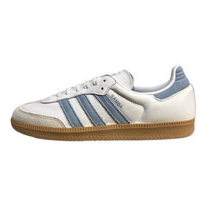 Adidas Samba OG womens sneakers in blue and white with a gum sole. New with defect, light mark on the right toe (see photos). Unworn condition with minor cosmetic flaw.
