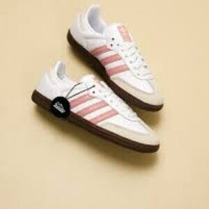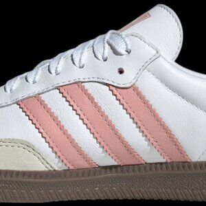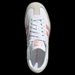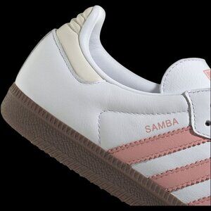 The Adidas Samba OG WMNS in Cloud White and Wonder Mauve is a fashionable and functional iteration of the iconic Samba line, originally designed as a soccer shoe. This version captures the classic essence with a contemporary twist, showcasing Adidas' commitment to blending heritage with modern design. The upper is predominantly rendered in cloud white leather, exuding a clean and versatile look, complemented by suede overlays that enhance texture and durability. The Wonder Mauve accents add a subtle touch of color, providing a soft contrast that appeals to both traditional and modern aesthetics. This colorway remains understated yet sophisticated, making it a versatile choice for a wide variety of outfits and occasions, from casual streetwear to sport-inspired ensembles. This design pays homage to the Samba's rich legacy while catering specifically to the nuances of women's footwear, striking a balance between nostalgic elements and contemporary needs.