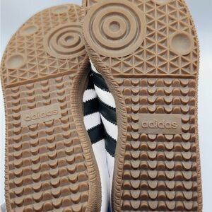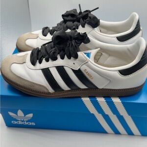 Classic Adidas Samba sneakers. Black and white leather with tan suede accents. Iconic style and comfort.