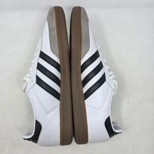 Classic terrace icon. Adidas Samba OG in white/black with grey suede T-toe and gum sole. Trefoil tongue, 3-Stripes, low-profile fit—perfect for everyday streetwear or indoor soccer style. Pre-owned; shows normal wear.