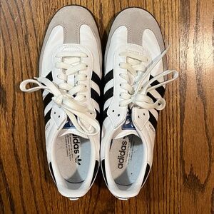 Classic Adidas Samba sneakers. White leather with black stripes. Size 9 Men’s and 11 Women. No flaws worn a few times