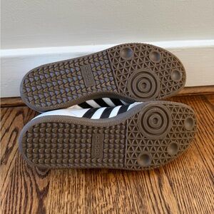 Classic Adidas Samba trainers. White leather with gray suede accents. Iconic black stripes and blue logo.