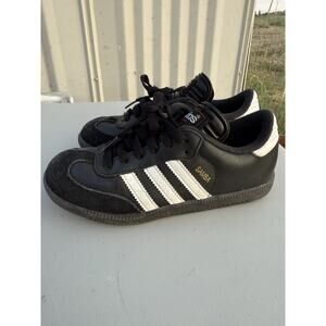 Get ready to hit the field in style with these Adidas Samba Youth Size 2 soccer shoes! These classic sneakers feature a sleek black and white design with a gum sole, perfect for indoor play or everyday wear. They are in excellent condition and ready for a new home.