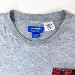 This is an Adidas sample t-shirt. Samples are used by Adidas to test new products before they are released to the general public. Own a piece of Adidas history with this unique tee with plaid pocket and red Adidas Originals branding.