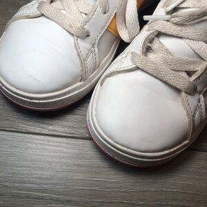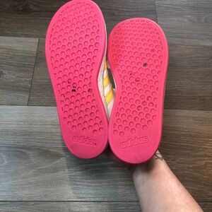 The Adidas Girls Grand Court X Disney Low Top Sneakers in white are designed for 1 1/2 year old girls. These sneakers feature a round toe shape, lace-up closure, and a flat heel for comfort. The shoes are part of the limited edition collaboration with Disney, showcasing Minnie Mouse and Adidas logos as accents. Made of blended fabric with a rubber outsole, these sneakers are perfect for travel, school, activewear, and casual occasions. With moderate cushioning and a standard shoe width, these athletic shoes are ideal for walking and other activities. SOLD OUT ONLINE! Please note that colors may appear different on screen. Comes from a smoke free home and pet friendly home. Please ask any questions that you may have.