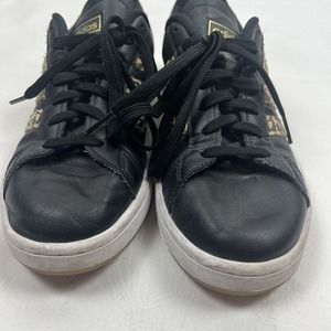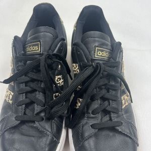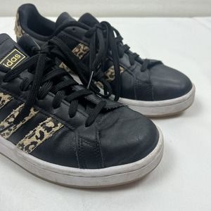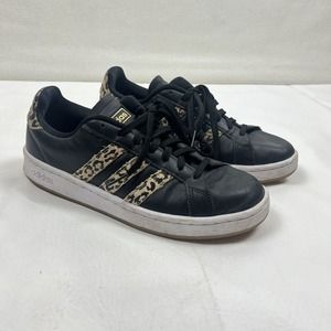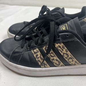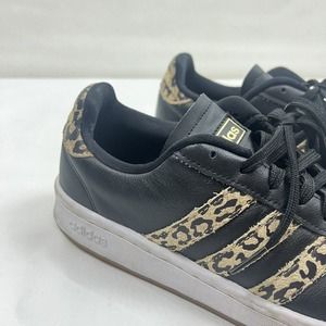 Adidas Shoes Womens 9 Black Leather Cheetah Three Stripe Sneakers with cloud foam comfort