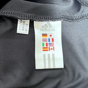 Nearly vintage Adidas short sleeve crew neck pullover shirt in black. Raglan style sleeve with with gray/white strip on shoulder and "Adidas" embroidered in white over left chest. Waffle-like texture/pattern. Excellent condition with one very small snag noted over left shoulder in back (pic).