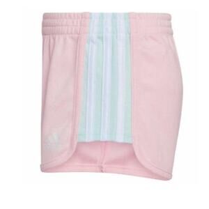 • Pink pull-on shorts with white three stripe and mint green detail on both legs and small adidas logo on lower leg