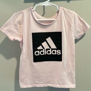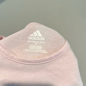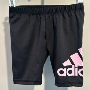 Excellent pre-owned condition, no flaws, toddler girl’s size 4 Adidas matching set. Baby pink short sleeve tee with black Adidas screen print graphic, no cracking. Shorts are classic black bike shorts with coordinating Adidas screen print on one leg.