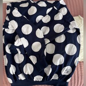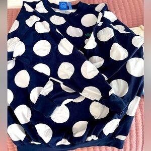 The Adidas Stan Smith Men's Size is Large Navy White Polka Dot Pullover is a classic and stylish sweatshirt made of breathable fabric. This features a crew neck neckline and long sleeves, making it perfect for all seasons. The navy white polka dot pattern adds a fun touch to the design with the Adidas logo