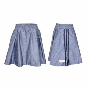 Style Description: Modest mini skirt (not too short - see means below) | Elastic waistband | Full skirt with a single pleat on either side of front and back | Slip-on | Iconic three stripes on both sides | Vertical, slit pockets at each hip