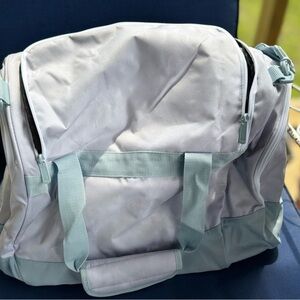 Compact Adidas duffel in sky blue and gray. Ideal for gym or travel.