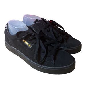 Adidas Originals Sleek Triple Black Sneakers. Adorable leopard print accenting at the heel and insole. Suede throughout. US women’s size 6.5.