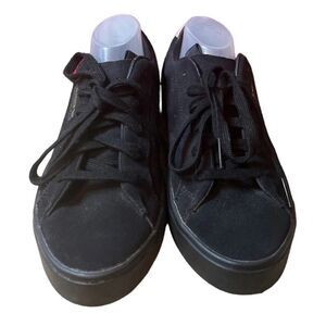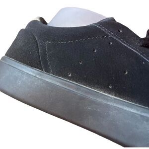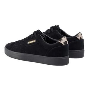 Adidas Originals Sleek Triple Black Sneakers. Adorable leopard print accenting at the heel and insole. Suede throughout. US women’s size 6.5.