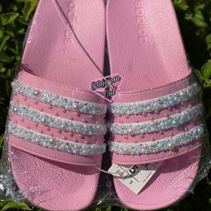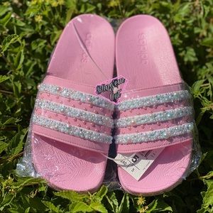 Pink Adidas Slides with custom bling over stripes as well as in between them