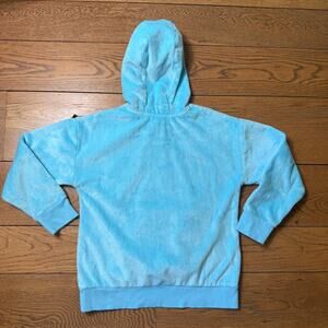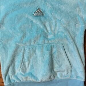 The hoodie is a aqua blue fleece with a small, silver Adidas badge front and center.
