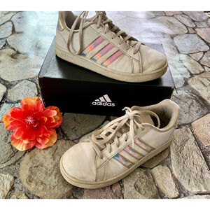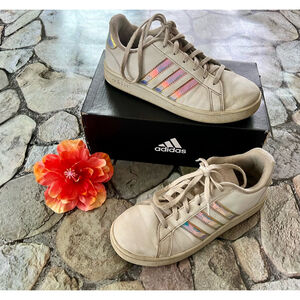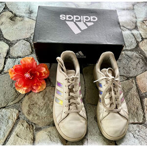 Adidas. Size 4. Iridescent stripe/white. Good condition. All wear shown in photo.