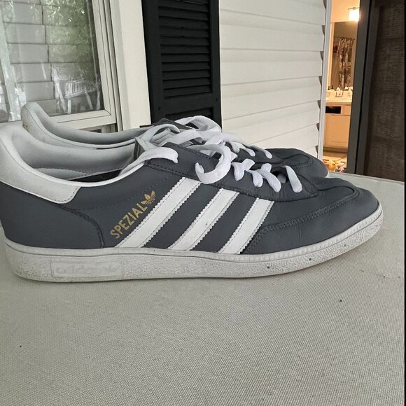 Adidas Originals. These are Adidas Spezial dark gray abd white leather shoes. Excellent condition. Now Flaws. Uppers and soles in like new condition. Worn very little-less than 10 times.