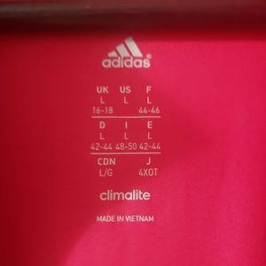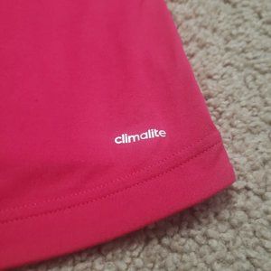 Pre loved Adidas Climalite long sleeve sport top with zipper in front. Vibrant pink color. Women's Size L. Half zip with high collar. Thumb holes. Reflective details. Slim fit.