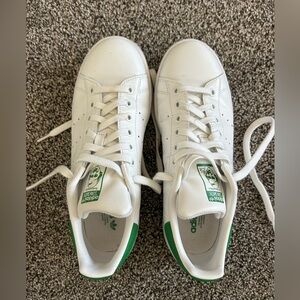 Crisp white Adidas shoes with green details. Ideal for everyday style. WOMENS SIZE 8