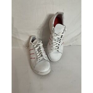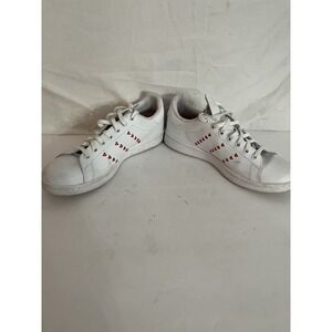 The product is a pair of women's Adidas Stan Smith sneakers in size 6, featuring a white and red color scheme with hearts as the theme. This lace-up style shoe is designed for casual occasions and offers comfort with a foam insole and rubber outsole. The sneakers are part of the adidas Stan Smith product line and are suitable for various seasons like summer, fall, and spring. The low-top shoe is adorned with the Adidas logo and is perfect for walking activities.