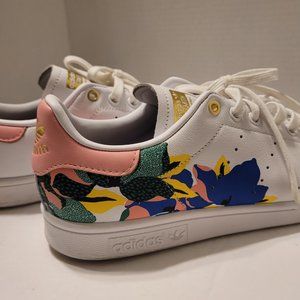 Adidas Stan Smith White Sneaker Pink/Green/Blue/Yellow Floral Print Lace up Closure Size 10 UK 8.5 EU 42