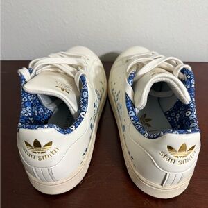This is a pair of Adidas Stan Smith x Liberty London women's shoes in an off-white colorway with a blue floral print on the heel tab and lining, accented with gold metallic details.