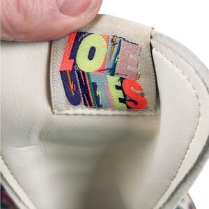Bring bold, expressive energy to your rotation with these limited-edition Adidas Stan Smith Love Unites Pride sneakers. Crafted in white leather, they feature vibrant multicolor embroidered graphics inspired by Keith Haring-style artwork and Pride motifs. The heel is finished w/ a unique black embroidered figure logo, & the tongue + insole carry the “Love Unites” label, making this pair both collectible & statement-making. A classic Stan Smith silhouette w/ an inclusive twist.