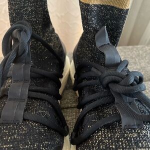 Stylish blue and white knit sneakers by Adidas Stella McCartney. Features a unique high-top design.