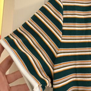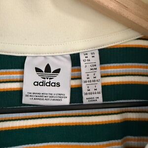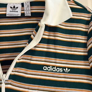 Like new Adidas polo collar dress. Fitted and midi length, stretch material, green and white, blue and orange stripes, with zipper at neck. Medium